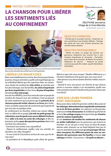 - Les partage d'expérience de Delphine qui a choisi le prétexte de l'écriture d'une chanson pour faire parler les personnes sur leur ressenti concernant la situation actuelle. Un projet qui peut se mener en chambre.