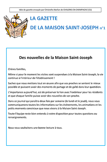 - Le contenu de Christelle Abellan concerne la mise en place une gazette bi-hebdomadaire afin de que les familles puissent avoir des nouvelles de leurs proches durant l'épidémie du COVID 19. Ce support est en format word pour que vous puissiez vous l'approprier.