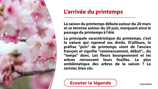 Réalisé à partir de « cerises interactives », vous pouvez découvrir les contes, histoires et légendes en lien avec le printemps grâce à des boutons interactifs. Les légendes sont sonores et retranscrites dans un livret à imprimer.