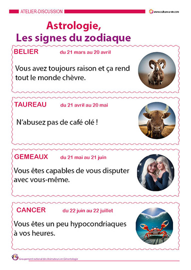 Ce support en lien avec les signes du zodiaque, permet d’ouvrir la discussion avec les aînés sur la place de l’astrologie dans leur vie quotidienne, en lisant tout d’abord, les caractéristiques de chaque signe du zodiaque. Poursuivez l’activité avec les phrases humoristiques pour chaque signe qui serviront d’exemples pour proposer aux résidents la création d’horoscopes drôles voire un peu fou, avec l’aide des supports fournis.
