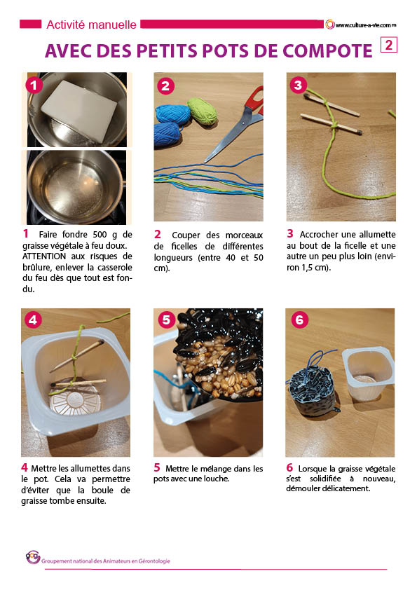 Cette activité consiste à créer un mobile avec des boules de graisses pour les oiseaux du jardin pour les aider à affronter l’hiver. Elle permet aux aînés de solliciter leur motricité fine et d’avoir une action en faveur de la nature. La fiche méthode permet de suivre étape par étape la confection de ce mobile avec deux propositions de contenants.