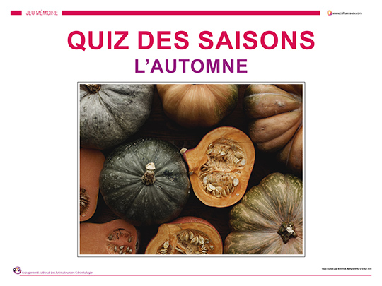 Nelly propose une série de diaporamas quiz sur les saisons. Voici l’un d’entre eux sur l’automne. Créé sous la forme d’un quiz, ce support d’animation à destination des personnes âgées comporte les réponses derrière chaque question. N’oubliez pas de « dézipper » le diaporama avant de le projeter. Cette animation peut être complétée avec les autres supports en lien avec l’automne. A retrouver dans le menu ressources d’animation/Fêtes calendaires/Automne.