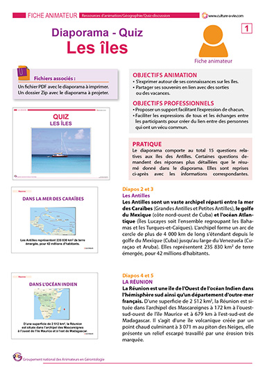 Caroline propose un support d’animation sous la forme d’un diaporama-quiz sur le thème des îles. Martinique, Réunion, Guyane, Guadeloupe, Nouvelle-Calédonie, 15 questions sur ces lieux paradisiaques vous permettront d’approfondir vos connaissances géographiques tout en échangeant sur les souvenirs de vacances.