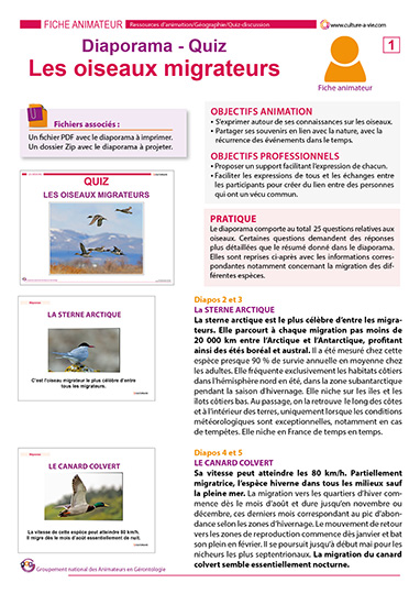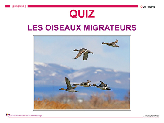 Ce support d’animation à destination des personnes âgées est créé sous forme d’un diaporama comporte au total 25 questions relatives aux oiseaux migrateurs. La fiche animateur liée permet d’avoir plus de détails sur la migration de chaque oiseau.
