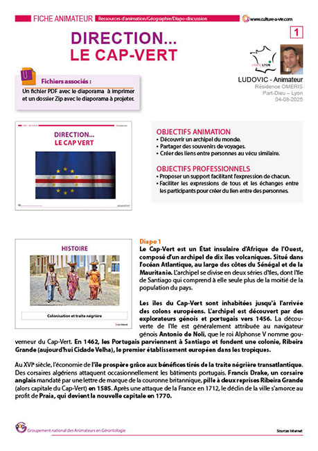 Ludovic partage un support d’animation pour faire voyager les résidents dans l’archipel des îles du Cap-vert, au large de la côte Ouest africaine. Tout en approfondissant leurs connaissances, les résidents pourront découvrir la richesse de cette nation insulaire avec son évolution au fil des siècles et en apprendre plus sur les dix îles qui composent le territoire cap-verdien. Autant de discussions pour s’évader et échanger sur ses souvenirs et ses voyages.