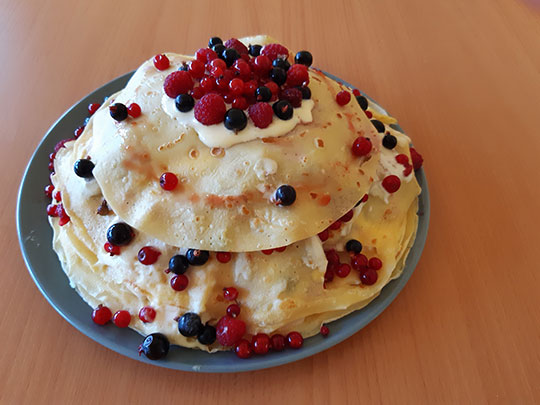 Des recettes « 3D » à imprimer et à assembler en pupitre pour ne laisser apparaître qu’une étape à la fois. Le triangle pupitre imaginé pour les recettes permet d’avoir à portée de vue seulement l’étape en cours. Il tourne au fur et à mesure des étapes. Ce support est adapté aux personnes présentant des troubles liés à la maladie d'Alzheimer. La recette du gâteau de crêpes aux fruits rouges est simple à réaliser.