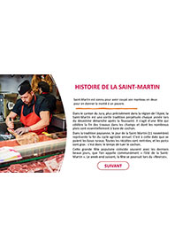 Audrey, animatrice en Suisse, vous propose de découvrir l’histoire de la Saint-Martin, tradition jurassienne. Cette fête ancestrale autour du cochon est célébrée chaque année, au mois de novembre, dans la région de l’Ajoie, aussi appelée pays de Porrentruy. Puis elle vous proposera de tester vos connaissances sur le sujet avec un questionnaire, mais également d’en apprendre plus sur le cochon (il faut cliquer sur les réponses proposées pour découvrir la bonne réponse qui s'affiche en vert).