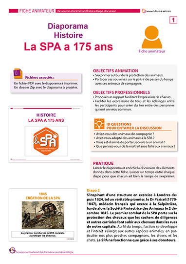 De sa création en 1845 à aujourd’hui, la Société Protectrice des Animaux (SPA) n’a jamais cessé de lutter pour pallier la condition de vie animale. Découvrez l’histoire de cet engagement à travers ce diaporama. Une fiche animateur apporte les détails de chaque diapositive. Un support à destination de tous les amis de bêtes.