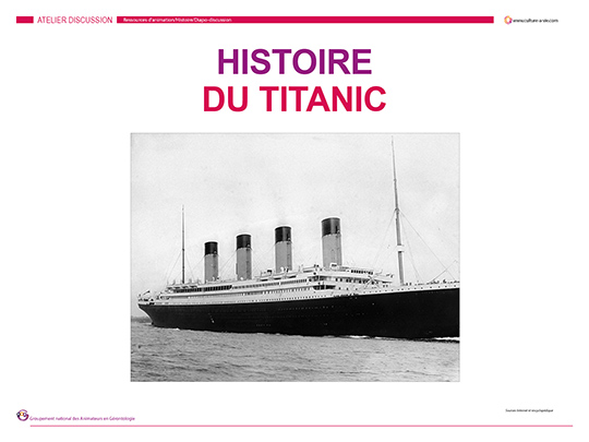 Nous vous proposons un diaporama sur l’histoire de ce paquebot disparu en mer au début du siècle dernier. Ce support d’animation permet d’aborder les souvenirs de chacun sur cet évènement, les conséquences des réussites technologiques pouvant être dépassées par les puissances de la nature à une époque où le progrès scientifique semblait impossible à arrêter. Il peut également faire se remémorer des voyages effectués en bateau.