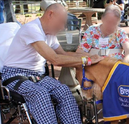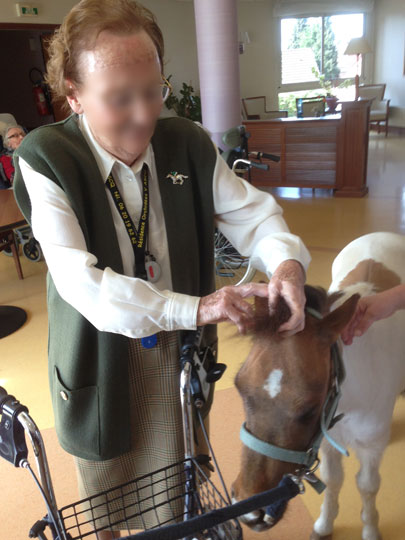 Marine Godin intervient avec des chevaux miniatures, à l'occasion d'une séance de médiation animale. La séance est basée essentiellement sur le contact avec les animaux et le soin. Les résidents les brossent, les promènent et peuvent également faire de petits parcours psychomoteurs. Les chevaux miniatures interviennent également dans les unités Alzheimer, dans les USLD et les UHR. Les chevaux sont capables de prendre l'ascenseur et interviennent également en chambre. Temps d'intervention : de 1 à 2 heures Zone d'intervention : départements 59/62 (dans un rayon de 65 km autour de Lens) Coût prestation : de 100 à 150 € (devis personnalisé sur demande) Recommandé par l'Ehpad Les Ogiers à Croix et l'Ehpad Saint-Julien à Cambrai (Nord) Contacts : marinegodin@hotmail.com - 06.59.26.71.86