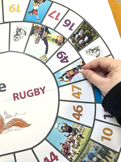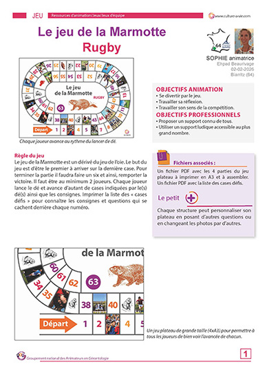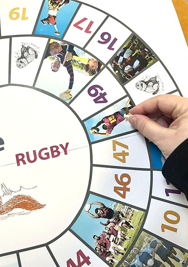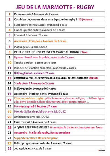 Ce support reprend le jeu de la Marmotte de Sophie décliné sur le thème du rugby. La règle du jeu est celle d’un jeu très connu qui consiste à déplacer son pion au rythme des lancers de dé. Une fiche « cases défis » avec des questions en lien avec le rugby est à imprimer, ainsi que les quatre morceaux du plateau (à imprimer au format A3). Le grand format permet à tous les joueurs de bien visionner le jeu. Les questions feront appel à la mémoire et les consignes permettront de jouer de façon simple et ludique.