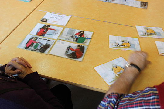 Dix scènes de la vie quotidienne ont ici été photographiées et divisées en 6 images. L’objectif de cet exercice est de remettre la scène dans l’ordre. Faire les courses, payer à la caisse, se raser, se laver le visage, se maquiller, sortir de la maison, planter une fleur, débarrasser la table, s’habiller et s’occuper du linge sont autant de scènes reprises ici avec la collaboration d’une neuropsychologue. L'altération des capacités de planification est fréquente dans le cadre des pathologies neuro-dégénératives et notamment de la maladie d'Alzheimer. Cet exercice permet de favoriser le maintien des étapes nécessaires à la réalisation de séquences d'action fréquemment rencontrées dans la vie quotidienne.Un support adapté à une animation individuelle