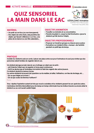 Géraldine, animatrice, propose un atelier sensoriel pour travailler sa mémoire et sa concentration. Les résidents deviennent à tour de rôle les meneurs du jeu en piochant des objets dans un sac que les autres doivent découvrir en posant des questions.