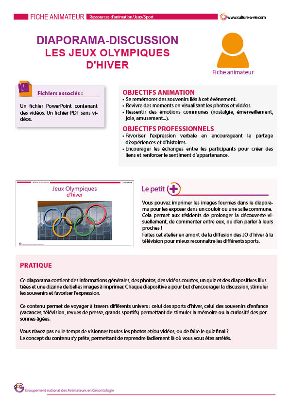 Ce diaporama, accompagné de sa fiche animateur, vous permettra de découvrir (ou redécouvrir) les Jeux Olympiques d’hiver : histoire, sports emblématiques, anecdotes, photos imprimables, vidéos et quiz final. Un contenu idéal pour éveiller la curiosité, échanger des souvenirs et faire voyager les participants à travers les sports d’hiver. Le diaporama est disponible en format PDF mais il ne contient pas les vidéos.