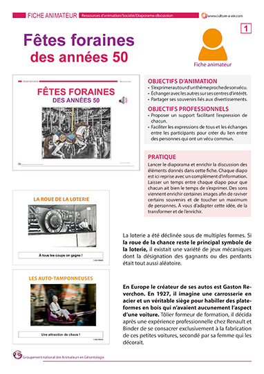 Manèges à sensations, gourmandises, arts divinatoires ou épreuves de force, les fêtes foraines du milieu du XXe siècle n’avaient rien à envier à celle d’aujourd’hui. Petite rétrospective en image sous forme de diaporama de ces attractions qui ont marqué la jeunesse de nos aînés. Des sons d’ambiance de fêtes foraines viennent enrichir le diaporama pour permettre de toucher un maximum de personnes y compris celles qui ont des problèmes de vue.