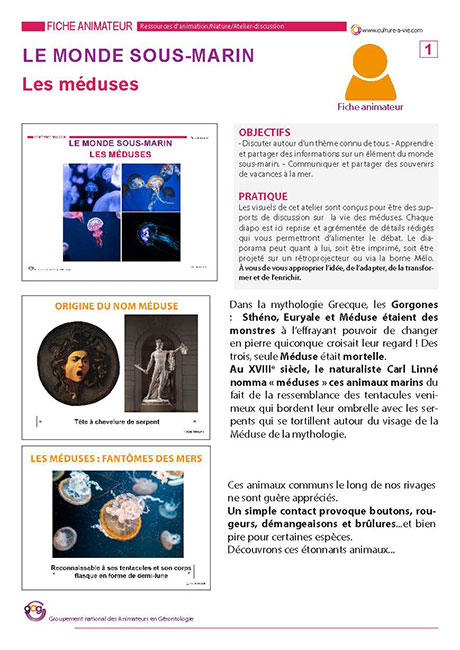 Qui dit plage dit bord de mer et souvent méduses. Ces animaux marins aussi beaux que piquants sont finalement assez méconnus. Ce diaporama reprend les différentes espèces et leur cycle de vie tout en donnant des informations sur leur origine, leur reproduction, leurs prédateurs. Un atelier-discussion très instructif qui permet par ailleurs d’échanger autour de ses souvenirs de vacances. N'oubliez pas de "dezipper" le diaporama avant de le lancer.