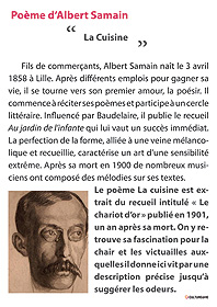 Cet atelier comportera au total 12 poèmes, tous écrits par des auteurs connus ou moins connus. Chaque mois un nouveau poème sera mis en ligne. Le principe est de réaliser un atelier mensuel en prenant le thème abordé dans le poème comme support de discussion en lisant le poème ou en l’écoutant grâce au diaporama son proposé. Le poème du mois est « La Cuisine» d’Albert Samain (XIXe siècle). Le poème « La Cuisine » fait suite à celui publié en Août du même auteur « Le Marché ». On y retrouve sa fascination de la chair avec une imagerie très précises des victuailles posées sur une table comme lors d’un retour de marché. Tous les poèmes seront à retrouver dans le menu « Ressources d’animation », thème « Littérature », catégorie « Poésie ». N’oubliez pas de « dezipper » le diaporama avant de le projeter en faisant un clic droit « Extraire tout »