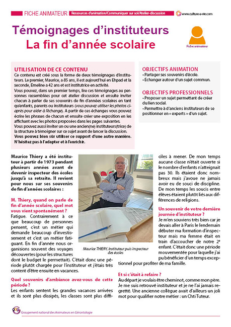 Ce support est composé de deux témoignages en miroir sur l’ambiance et les souvenirs de fin d’année scolaire. Celui d’un ancien instituteur aujourd’hui en Ehpad et celui d’une jeune institutrice en activité. La lecture de ces deux récits permet de se replonger dans ces semaines un peu particulières et qui invitent aux souvenirs d’enfance ou de parents voire d’instituteur-trice.