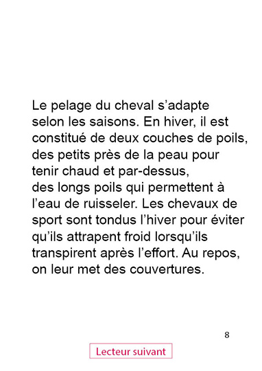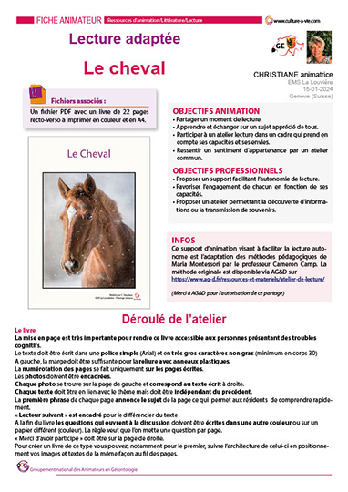 Ce livre, créé par Christiane, animatrice suisse, et son équipe sur le thème du cheval, est destiné aux personnes présentant des troubles cognitifs tels qu’Alzheimer. Inspiré de la méthode Montessori, ce livre permet une lecture autonome lors d’un atelier lecture. Christiane donne, dans la fiche animateur la manière dont elle utilise ce support afin que chacun puisse se sentir valorisé et avoir un sentiment d’appartenance à un groupe.