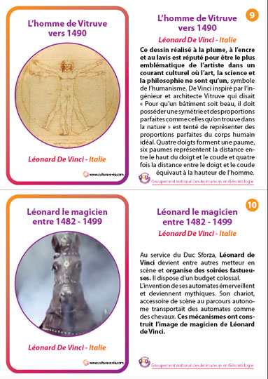 2019 représente l’anniversaire des 500 ans de la mort du créateur de la Joconde, Léonard de Vinci. L’occasion de revenir sur le parcours de ce peintre et ingénieur de génie. Ce support permet de mettre en place un atelier-discussion très visuel à l’aide d’une frise chronologique. 18 cartes retraçant les grands événements de la vie de Léonard de Vinci sont à afficher sur une frise chronologique pour mieux visualiser le déroulement de sa vie qui débuta en Toscane en 1452 jusqu’à sa mort en 1519 à Amboise. Ce support comporte un petit « plus ». Il s’agit d’un dépliant avec 8 anecdotes sur la vie de l’artiste Italien permettant de terminer l’animation sur une note plus légère.