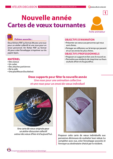 Afin de communiquer sur le temps qui passe et pour célébrer la nouvelle année, ce support d’animation propose deux cartes originales à concevoir facilement. L’une est dédiée à la discussion dans un atelier collectif autour du thème des souhaits d’hier et d’aujourd’hui. L’autre agrémentée d’un mot personnalisé sera envoyée par les aînés à l’élu(e) de leur choix.