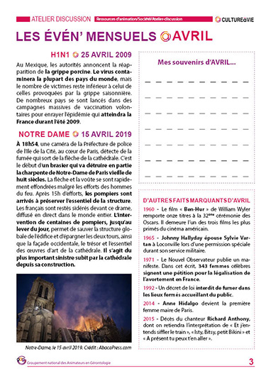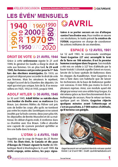 Ce contenu revient sur des événements qui se sont passés pendant les mois d’Avril entre 1940 et 2020. Des événements pour lancer des débats et pour inviter les résidents de vos établissements à partager leurs souvenirs. Les résidents pourront laisser un écrit en dernière page sur un fait qui ne figure pas au contenu ou un témoignage sur un événement abordé.