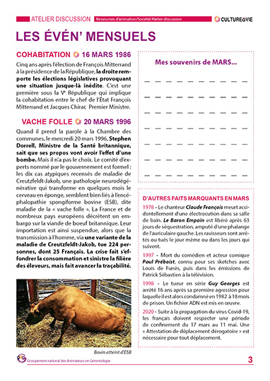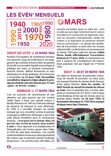 Ce contenu revient sur des événements qui se sont passés pendant les mois de mars entre 1940 et 2020. Des événements pour lancer des débats et pour inviter les résidents de vos établissements à partager leurs souvenirs. Les résidents pourront laisser un écrit en dernière page sur un fait qui ne figure pas au contenu ou un témoignage sur un événement abordé.