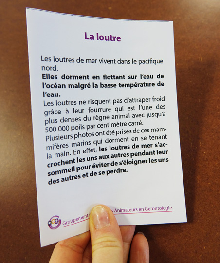 16 cartes proposent des petites informations simples et ludiques pour passer un moment d’échanges autour de sujets légers. 10 sont consacrées aux animaux et 6 à des célébrités. Du cerveau de l’autruche plus petit que son œil à la mort de Lawrence d’Arabie qui en a sauvé des milliers, retrouver des informations vraies mais insolites sur des cartes à partager en animation individuelle ou collective. Ce support nommé1 sera suivi d’autres séries de « Petits savoirs futiles »