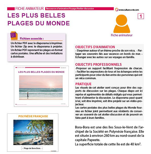 Ce diaporama reprend les images de 23 plages paradisiaques à travers le monde et la France. Des vues à couper le souffle permettant un voyage virtuel à travers différents lieux géographiques. Un support de discussion sur les souvenirs de vacances de chacun. N'oubliez pas de "dezipper" le diaporama avant de le lancer.