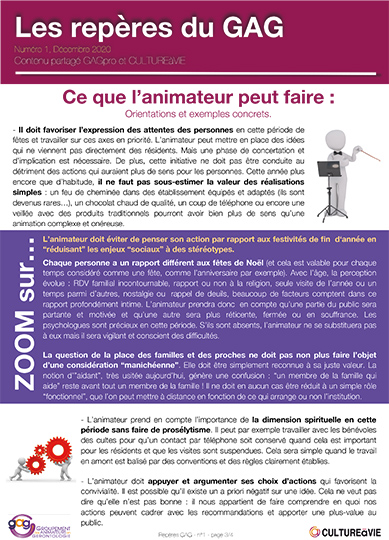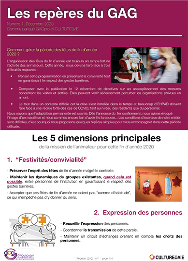 Comment gérer la période des fêtes de fin d’année 2020 ? L’organisation des fêtes de fin d’année est toujours un temps fort de l’activité des animateurs. Cette année, les conditions d’exercice de notre métier sont difficiles, c’est pourquoi nous proposons quelques repères simples et pratiques pour vous accompagner dans cette période délicate autour de 5 dimensions principales : festivités/convivialité, expression des personnes, solidarité professionnelle, médiation et professionnalisme, communiquer et informer.