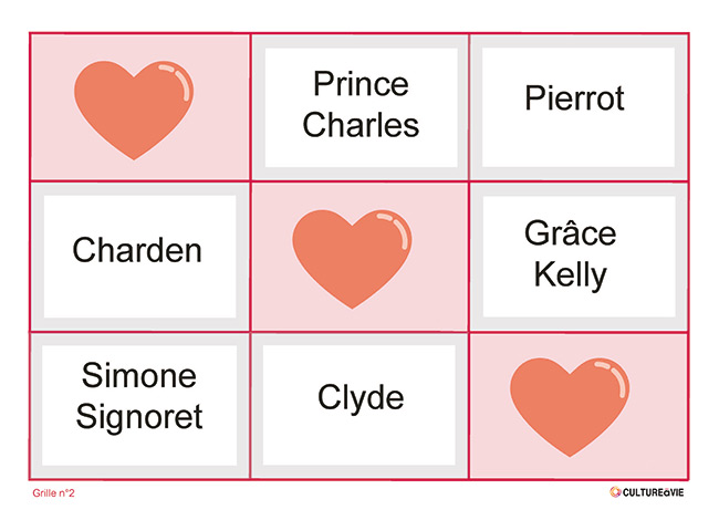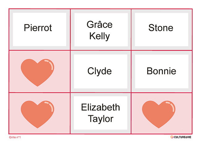 Aurélie propose un loto dédié aux couples célèbres pour fêter la Saint Valentin. Vous retrouvez 20 couples célèbres répartis sur les grilles, dont Roméo et Juliette, Bonnie et Clyde, Prince Charles et Lady Di et bien d’autres ! Un bon support pour allier jeu et fête.