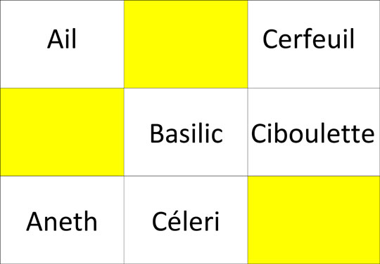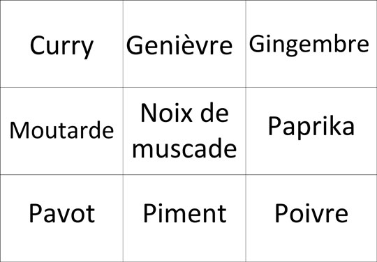Sur le même principe que le loto traditionnel, Angélique a remplacé les chiffres par des herbes aromatiques. Des fichiers préparés vous permettent d’imprimer les cartes de loto ainsi que les vignettes des 40 herbes choisies pour le tirage. Une fiche explicative vous permettra de lancer la discussion sur chaque herbe et de partager les secrets de chacun sur leurs vertus.