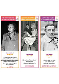 Ce support d’animation contient 28 marque-pages reprenant les citations drôles légendaires du cinéma français. Ce contenu permet d’animer un atelier souvenirs autour des scènes emblématiques drôles du cinéma français. Illustré par le portrait de l’acteur ou l’actrice principal ou par une scène du film, ce support pourra être prolongé par la retransmission de films humoristiques qui ont marqué le paysage audiovisuel de la seconde moitié du XXe siècle. Chacun pourra ensuite repartir avec le marque-page de son choix.