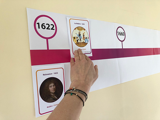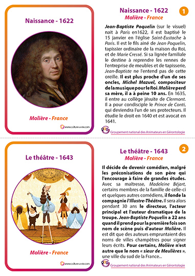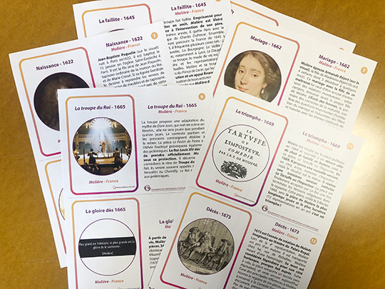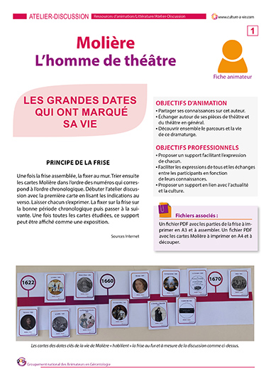 Ce support permet de mettre en place un atelier-discussion très visuel à l’aide d’une biographie de l’auteur associée à 12 cartes qui retracent les grands événements de sa vie à afficher sur une frise chronologique pour mieux visualiser l’évolution de sa carrière. N’hésitez pas à compléter cet atelier avec le théâtre audio de Molière déjà disponible sur CULTUREàVIE.