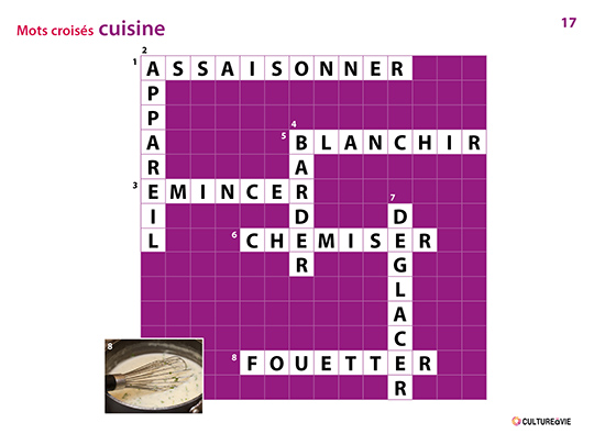 Ce diaporama mots croisés cuisine peut être visionné sur un ordinateur pour un travail en binôme avec la personne âgée ou en groupe mais également en activité individuelle en imprimant les feuilles pour la personne. Appareil, fouetter, chemiser, assaisonner, au total 8 termes culinaires sont à retrouver dans ce jeu de mots croisés. Les amateurs de cuisine devraient retrouver à travers ce jeu de beaux souvenirs à se remémorer et à partager.