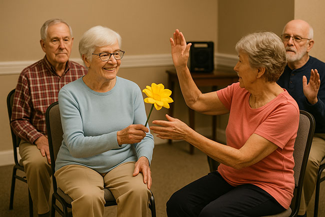 Cette activité fait suite aux précédentes activités d’une série intitulée « Des mouvements en s’amusant ». Elle est destinée aux personnes âgées pour encourager une mobilité douce, travailler la coordination, tout cela dans un cadre convivial, d’une façon ludique et dynamique.
