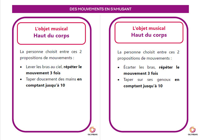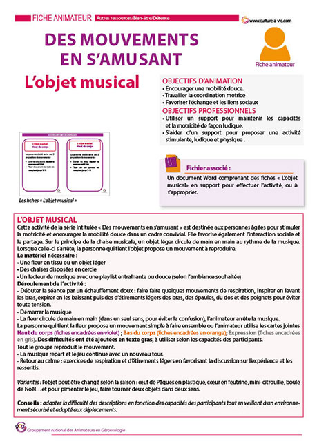 Sur le principe de la chaise musicale, un objet léger circule de main en main au rythme de la musique. Lorsque celle-ci s’arrête, la personne qui tient l’objet propose un mouvement à reproduire. Des fiches sont proposées en fichier Word et PDF pour effectuer l’activité, ou à modifier à volonté.