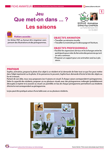 Pour poursuivre avec l’idée de Sophie, animatrice, nous vous proposons un nouveau contenu dans le thème « Que met-on dans ? » Il est cette fois dédié aux saisons. L’activité fait appel à la mémoire visuelle et stimule la motricité par le découpage et l’écriture. Dans le cas des saisons, il est question de se souvenir par exemple quand sont célébrés Pâques ou Halloween, à quel moment de l’année les graines commencent à germer etc… Un jeu adapté à une animation individuelle ou collective.