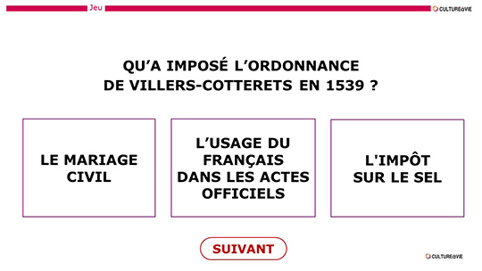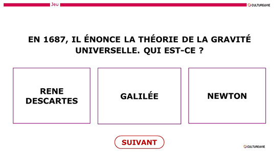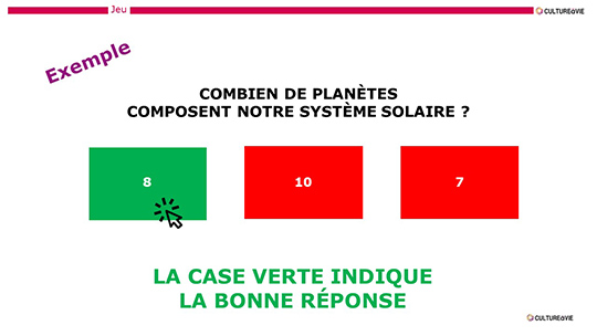 Ce quiz interactif proposé par Virginie est articulé autour de 34 questions. Chaque question posée comporte 3 choix de réponses. Les thèmes vont de l’histoire à la peinture en passant par la science et le cinéma. Les établissements qui ne possèdent pas Powerpoint pourront visionner le contenu en cliquant sur le lien ci-dessous afin d’installer la visionneuse gratuite.
