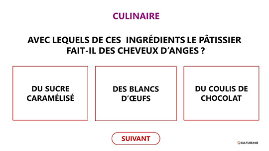 Ce quiz à projeter permettra de réviser ses connaissances sur plusieurs thèmes tels que la cuisine, l’art, l’histoire, la géographie… Pour chaque question posée, des propositions sont données, les personnes devront trouver la bonne réponse. Créé sous forme de QCM, la réponse à chaque question s'affiche en vert en un clic (il faut cliquer sur les réponses proposées pour découvrir la bonne réponse qui s'affiche en vert). Ce quiz composé de 28 questions apportera des connaissances supplémentaires ou complémentaires à chacun.