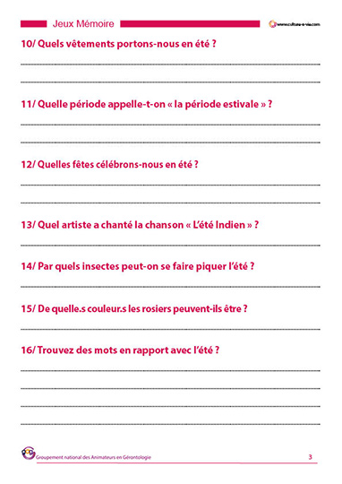 Le quiz proposé par Christelle permet d’échanger sur l’été. Composé de 25 questions et 6 devinettes, ce support d’animation est proposé en version à imprimer. Certaines questions font appellent aux connaissances et d’autres aux souvenirs ou expériences des personnes âgées. La première partie comporte les questions avec un espace pour écrire les réponses et la seconde partie comporte la question et la réponse. Vous pouvez également imprimer seulement la 2e version et jouer à l’oral en individuel.