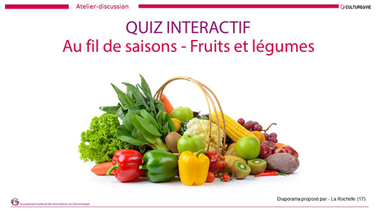 Ce quiz à projeter risque de vous mettre en appétit ! Ada propose de répondre à ce questionnaire sur les fruits et légumes de manière interactive. Pour chaque question posée, des propositions sont données, les personnes devront trouver la bonne réponse. Créé sous forme de QCM, la réponse à chaque question s'affiche en vert en un clic (il faut cliquer sur les réponses proposées pour découvrir la bonne réponse qui s'affiche en vert). Ce quiz composé de 45 diapositives est un mélange d’images, d’expressions et d’informations qui apportera des connaissances supplémentaires ou complémentaires à chacun. Ce diaporama vient en complément d’autres ressources d’animations, que vous pouvez retrouver sur la plateforme CULTUREàVIE (en tapant « fruit et/ou légumes » dans l’espace mot clé). Les établissements qui ne possèdent pas Powerpoint pourront visionner le contenu en cliquant sur le lien ci-dessous afin d’installer la visionneuse gratuite.