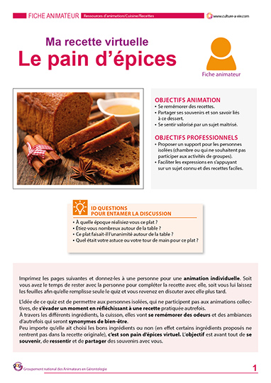 Miel, cannelle farine, œufs… Tous ces ingrédients ont été familiers des aînés durant leur activité à la maison et la majorité des personnes connaît les ingrédients qui compose le pain d’épices. A travers ce quiz ingrédients qui est créé pour une activité individuelle, l’aîné pourra sur papier à l’aide de case à cocher, recréer sa recette de pain d’épices (bonne ou mauvaise peu importe) et se laisser aller à partager ses souvenirs d’ambiance de cuisine, d’odeurs, de repas en famille…