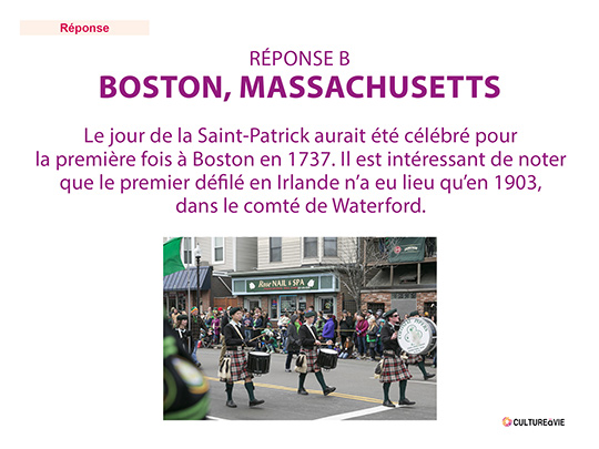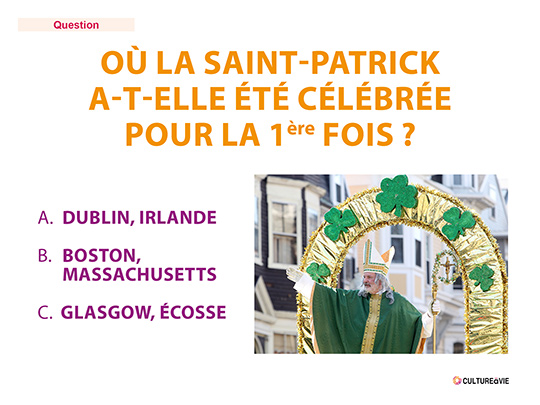 Ce quiz permettra aux résidents d’en connaître plus sur la Saint-Patrick célébrée le 17 mars. Trois réponses possibles à chaque question. Les réponses sont données en fin de quiz. Complétez ce quiz avec la création d’une broche de la Saint-Patrick proposée par Marie-Claire.