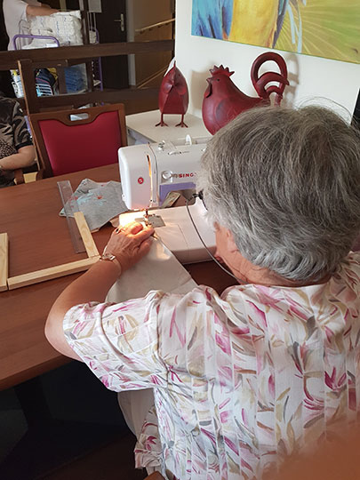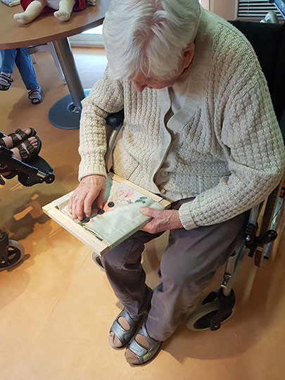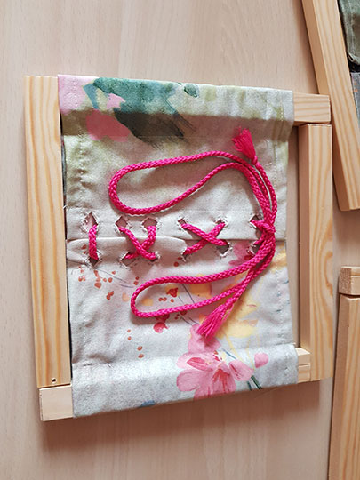 Anaïs partage un concept de cadres destinés à conserver un maximum d’autonomie dans les gestes du quotidien et notamment ceux liés à l’habillement. Fermetures Eclair, lacets et boutons cousus sur un cadre permettent de faire et défaire à son rythme. Des gestes simples qui visent à travailler la dextérité fine. Anaïs fournit les photos des cadres et le plan de ces derniers.