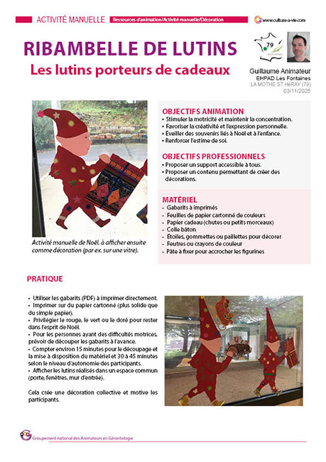 Guillaume propose une activité manuelle de Noël facile et ludique : la réalisation de lutins porteurs de cadeaux. Cette activité, spécialement conçue pour les personnes âgées, stimule la créativité, la motricité et apporte une touche festive à vos animations. Simple à réaliser grâce aux gabarits fournis, ce contenu encourage la créativité, réveille l’esprit de Noël et permet de décorer la structure avec des réalisations collectives pleines de couleurs et de bonne humeur.