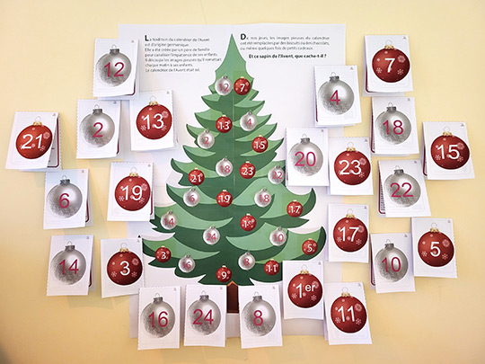 Vous pouvez associer ce contenu au sapin de l’Avent à reconstituer pour afficher les différentes cartes-boules qui correspondent à chaque boule du sapin afin d’en faire profiter toutes les personnes de la structure.