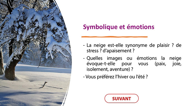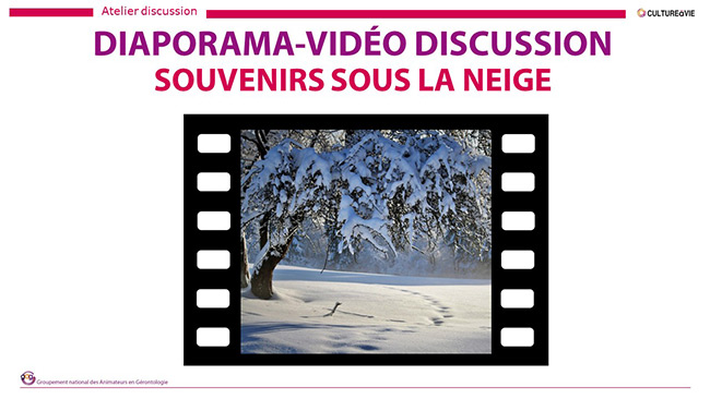 Un diaporama contenant sept vidéos en rapport avec l’hiver et la neige permettra aux ainés d’échanger sur leurs sentiments, leurs sensations, leurs souvenirs, histoires, en lien avec ce moment de l’année. Chacune des vidéos est suivie d’une diapositive contenant des questions pour encourager la discussion. Etant composé de vidéos, ce support peut être un peu plus long à télécharger donc ne vous inquiétez pas patientez.