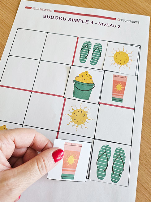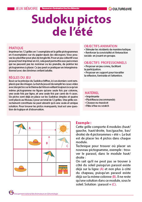 Ce jeu de sudoku simplifié est spécialement conçu pour les personnes âgées. Il propose des grilles 4x4 accessibles, illustrées de pictogrammes sur le thème de l’été. Idéal pour stimuler la mémoire et la logique tout en s'amusant, ce support comprend 2 niveaux de difficulté avec 6 grilles chacun. Ludique, coloré et facile à prendre en main, il favorise la concentration et l’échange. Une activité parfaite pour des ateliers de détente individuelle ou des temps calmes en petit groupe, à la fois cognitifs et récréatifs.