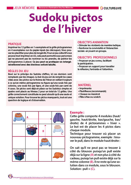 Ce jeu de sudoku simplifié est spécialement conçu pour les personnes âgées. Il propose des grilles 4x4 accessibles, illustrées de pictogrammes sur le thème de l’hiver. Idéal pour stimuler la mémoire et la logique tout en s'amusant, ce support comprend 2 niveaux de difficulté avec 6 grilles chacun. Ludique, coloré et facile à prendre en main, il favorise la concentration et l’échange. Une activité parfaite pour des ateliers de détente individuelle ou des temps calmes en petit groupe, à la fois cognitifs et récréatifs.